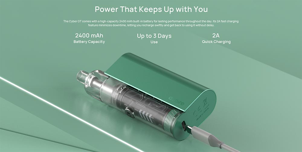 Το Cyber GT είναι μια συσκευή RDTL και MTL που έχει σχεδιαστεί για να είναι συμβατή με τις δεξαμενές TG Pod. Διαθέτει ισχυρή ενσωματωμένη μπαταρία 2400 mAh, τρεις προσαρμόσιμες λειτουργίες, ρυθμιζόμενα επίπεδα ισχύος και γρήγορη φόρτιση 2Α. Εξοπλισμένο επίσης με 3 ενδεικτικές λυχνίες για τον έλεγχο τις μπαταρίας.