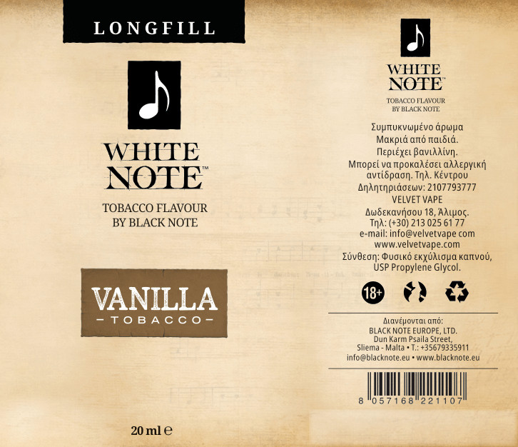Η βανίλια και ο καπνός ταιριάζουν απόλυτα, και η έκδοση της White Note είναι ασύγκριτη. Ο συνδυασμός της γλυκύτητας και του αρώματος της βανίλιας και του φυσικού εκχυλίσματος καπνού, είναι καθαρή απόλαυση!