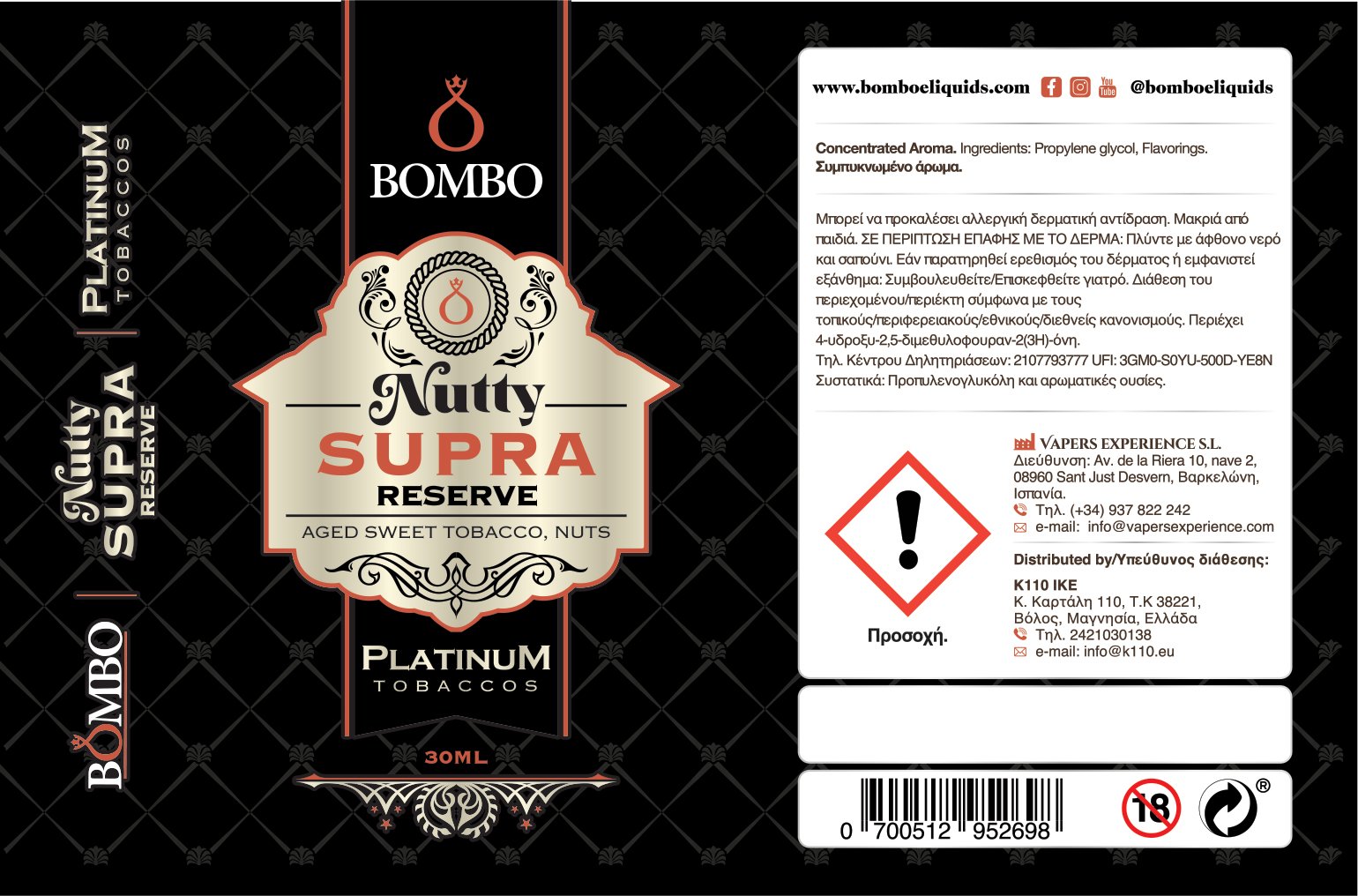Νutty Supra Reserve, η νέα παραλλαγή που σαν βάση χρησιμοποιεί την βραβευμένη και ίσως την πιο αγαπημένη ημικαπνική γεύση της χρονιάς (Supra Reserve Best Tobacco E-liquid Vapexpo 2022), μαζί με επιλεγμένους ξηρούς καρπούς και φυστικοβούτυρο που προστίθενται για την δημιουργία του επόμενου best seller!