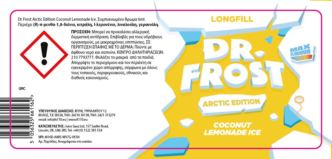 Το Coconut Lemonade Ice Arctic Edition από την Dr Frost σας επιτρέπει να απολαύσετε γλυκές νότες καρύδας συνδυασμένες με λεμονάδα και μια δόση πάγου.