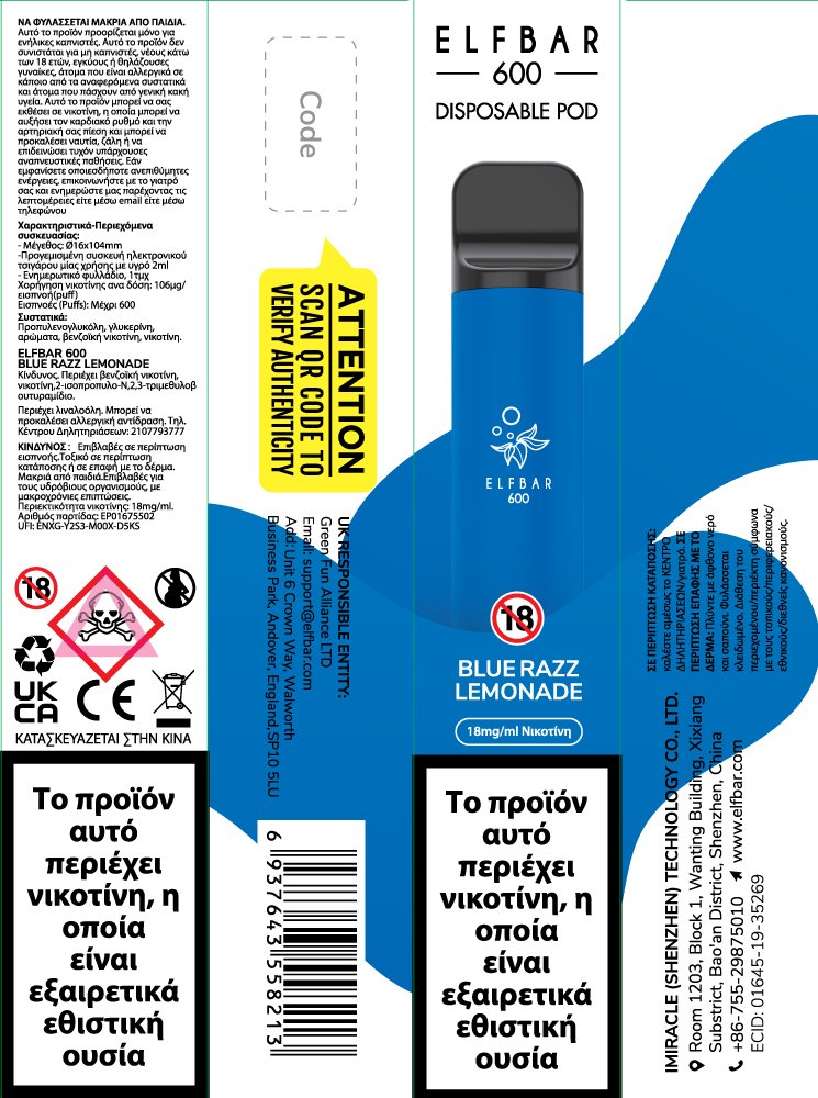 Elf Bar 600 20mg 2ml Blue Razz Lemonade GR