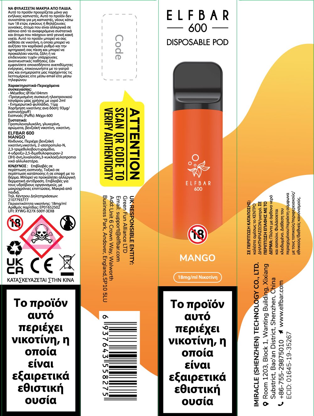 Elf Bar 600 20mg 2ml Mango | Disposable προγεμισμένο με υγρό αναπλήρωσης και απόδοση έως 600 εισπνοές