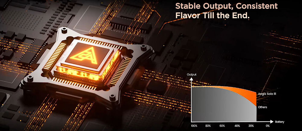 Στο εσωτερικό του Aegis Solo Ⅲ βρίσκεται το πρωτοποριακό AS Chip 4.0. Αυτό το έξυπνο τσιπ υποστηρίζει την τεχνολογία σταθερής ώθησης εξόδου. Ακόμη και όταν η μπαταρία είναι χαμηλά, ένα σύστημα σταθερής απόδοσης όλων των εποχών βελτιστοποιεί την ισχύ για να εξασφαλίσει σταθερή γεύση.