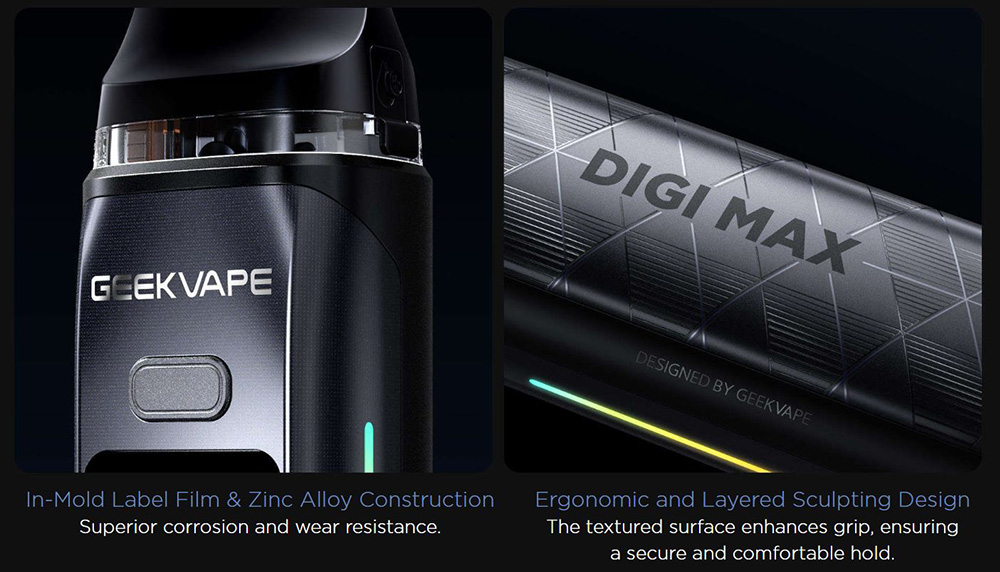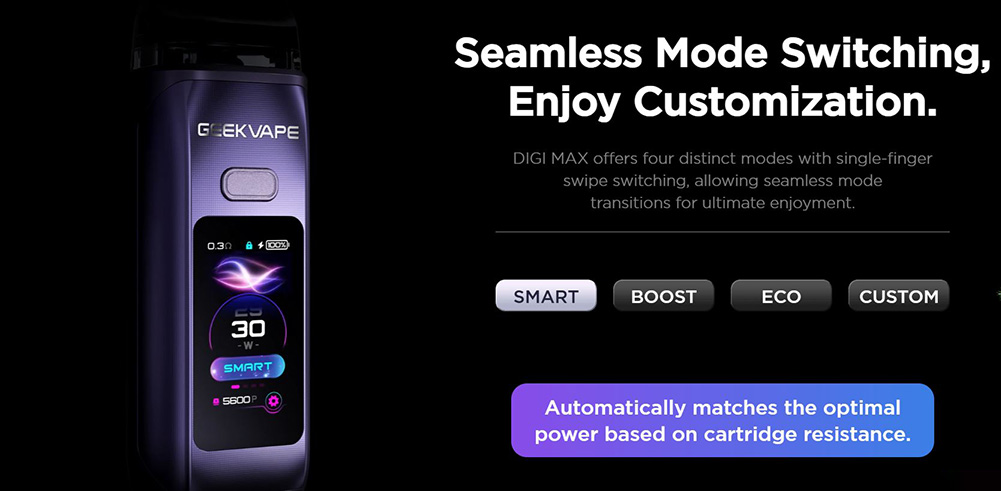 Το Geekvape Digi Max είναι ένα pod mod υψηλής απόδοσης που διαθέτει μέγιστη ισχύ 80W, οθόνη αφής με ανάλυση 2K και μπαταρία 3000mAh που φορτίζει πάνω από 50% σε μόλις 20 λεπτά. Το προηγμένο σύστημα ροής αέρα του ενισχύει την πυκνότητα ατμού και τη γεύση, ενώ ο εργονομικός σχεδιασμός εξασφαλίζει άνετο κράτημα.
