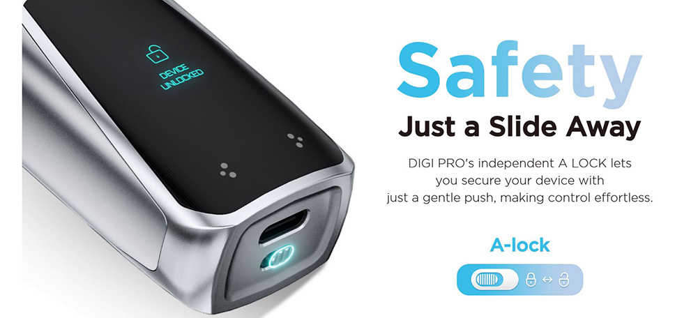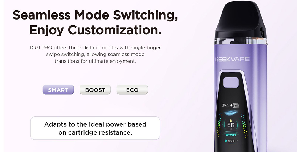 Το Geekvape Digi Pro είναι ένα συμπαγές pod mod που διαθέτει μπαταρία 2000mAh με μέγιστη ισχύ 40W, διαδραστική έγχρωμη οθόνη αφής 0,96 ιντσών και χωρητικότητα 5 ml pod. Προσφέρει λειτουργίες Smart, Boost και ECO, κορυφαίο έλεγχο στην ροή του αέρα και συμβατότητα με τις δεξαμενές Geekvape J και JR, που καλύπτουν απο MTL μέχρι και RDL άτμισμα.