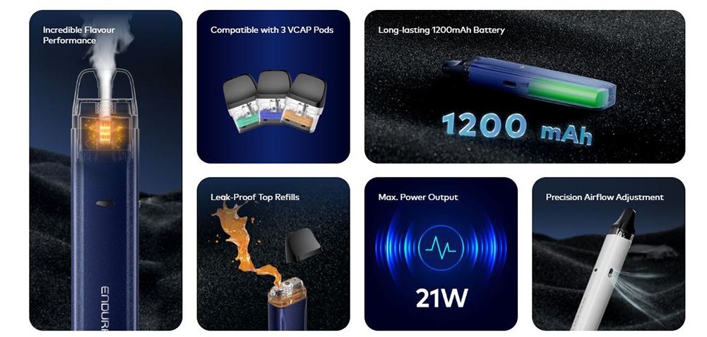Το Endura V είναι μια φιλική συσκευή για νέους χρήστες που στοχεύει να προσφέρει ένα ικανοποιητικό MTL άτμισμα, με μια ισχυρή μπαταρία 1200 mAh που παρέχει έως και 21W ισχύ.