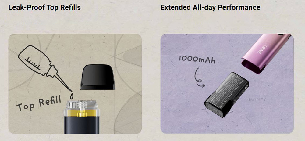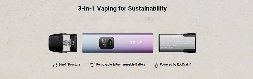 Παρουσιάζοντας την δομή 3 σε 1 – κύριο σώμα συσκευής, ατμοποιητής, αφαιρούμενη και επαναφορτιζόμενη μπαταρία – το Trine επενδύει στη βιωσιμότητα και την εξοικονόμηση, εξασφαλίζοντας εξαιρετική απόδοση με το καινοτόμο σύστημα αντικατάστασης μπαταρίας και την τεχνολογία EcoDrain™