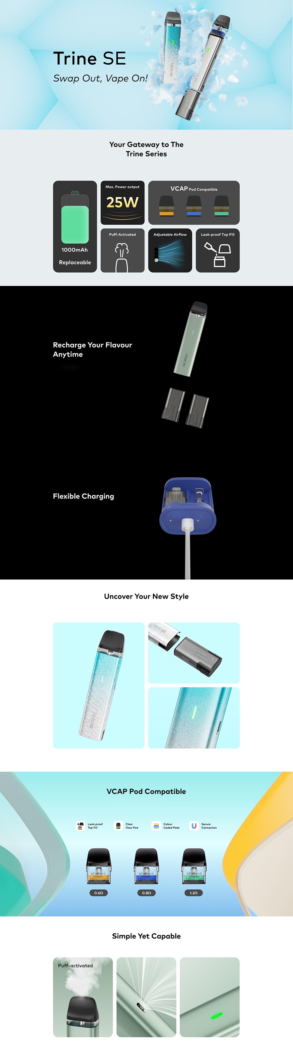 Συνεχίζοντας την παράδοση με τις αντικαταστάσιμες μπαταρίες, το Trine SE προσφέρει μια προσιτή είσοδο στη σειρά Trine. Σχεδιασμένο για ευκολία με αυτόματη εισπνοή, το Trine SE προσφέρει μια εμπειρία ατμίσματος MTL με αντικαταστάσιμη μπαταρία 1000mAh και είναι συμβατό και με τα 3 VCAP pod.