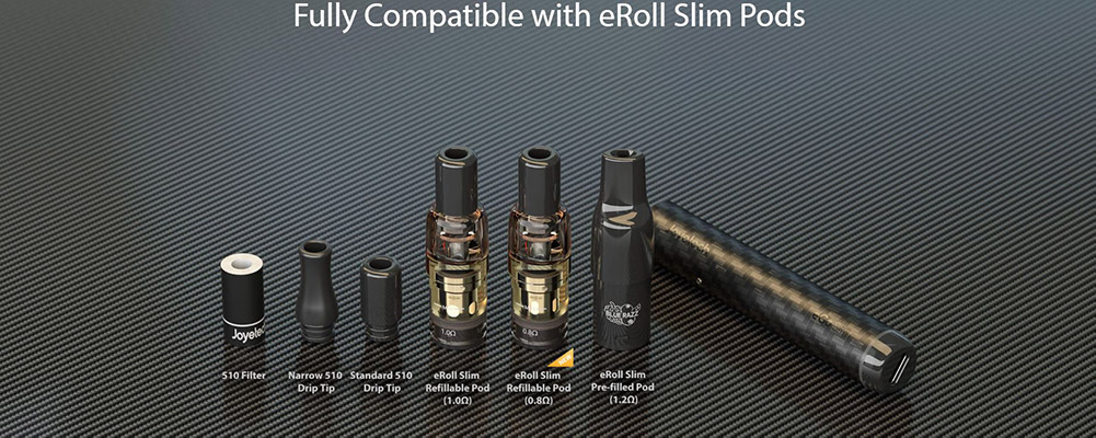 Το eGo Slim είναι πλήρως συμβατό με όλες τις eRoll Slim Pods δεξαμενές.