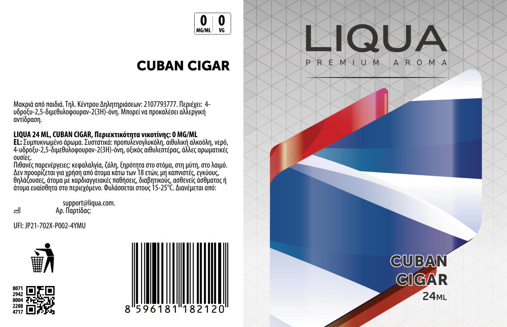 Cuban Cigar Flavorshot, ένα γνήσιο άρωμα Κουβανέζικου πούρου που σε ταξιδεύει από την πρώτη εισπνοή στην Κούβα. H Liqua δημιούργησε για εσάς ένα υπέροχο υγρό αναπλήρωσης για το ολοήμερο άτμισμα σας. Στην εισπνοή ξεχωρίζει η γεύση του καπνού, ενώ στην εκπνοή ξεχωρίζει ένα γλυκό τελείωμα που θα απογειώσει τους γευστικούς σας κάλυκες.
