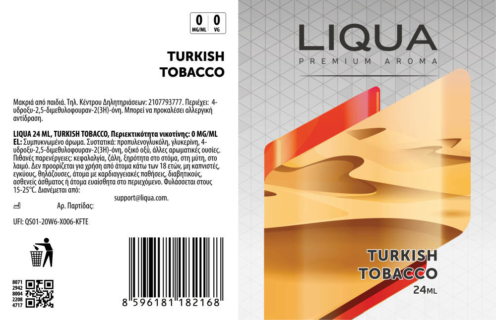 To Flavorshot Liqua Turkish Tobacco είναι ένα δυναμικό καπνικό flavorshot για τους λάτρεις των γνήσιων καπνικών αρωμάτων. Πρόκειται για ένα Ανατολίτικο άρωμα, που στην εισπνοή σας δίνει μία πικάντικη γεύση του καπνού ενώ στην εκπνοή ξετυλίγεται ένα ζεστό, γλυκό τελείωμα μελιού που θα σας εντυπωσιάσει.