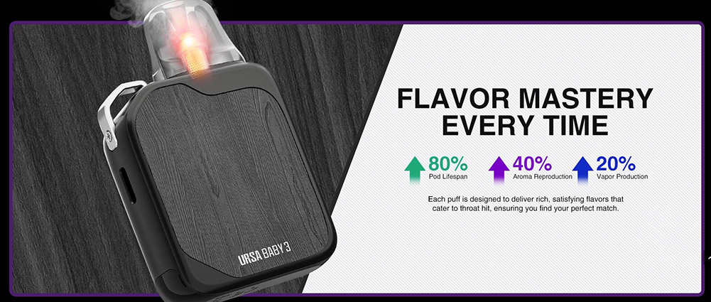 Το URSA BABY 3, παρέχει ισχύ 30W και διαθέτει το τσιπ Quest 2.0 για άμεση απόδοση. Ο κρυστάλλινος, ανθεκτικός στη φθορά σχεδιασμός του συνδυάζει κομψό στυλ με σκληρή ανθεκτικότητα, ενώ η ευκρινή οθόνη 1,3 ιντσών σας ενημερώνει για όλες τις βασικές πληροφορίες.