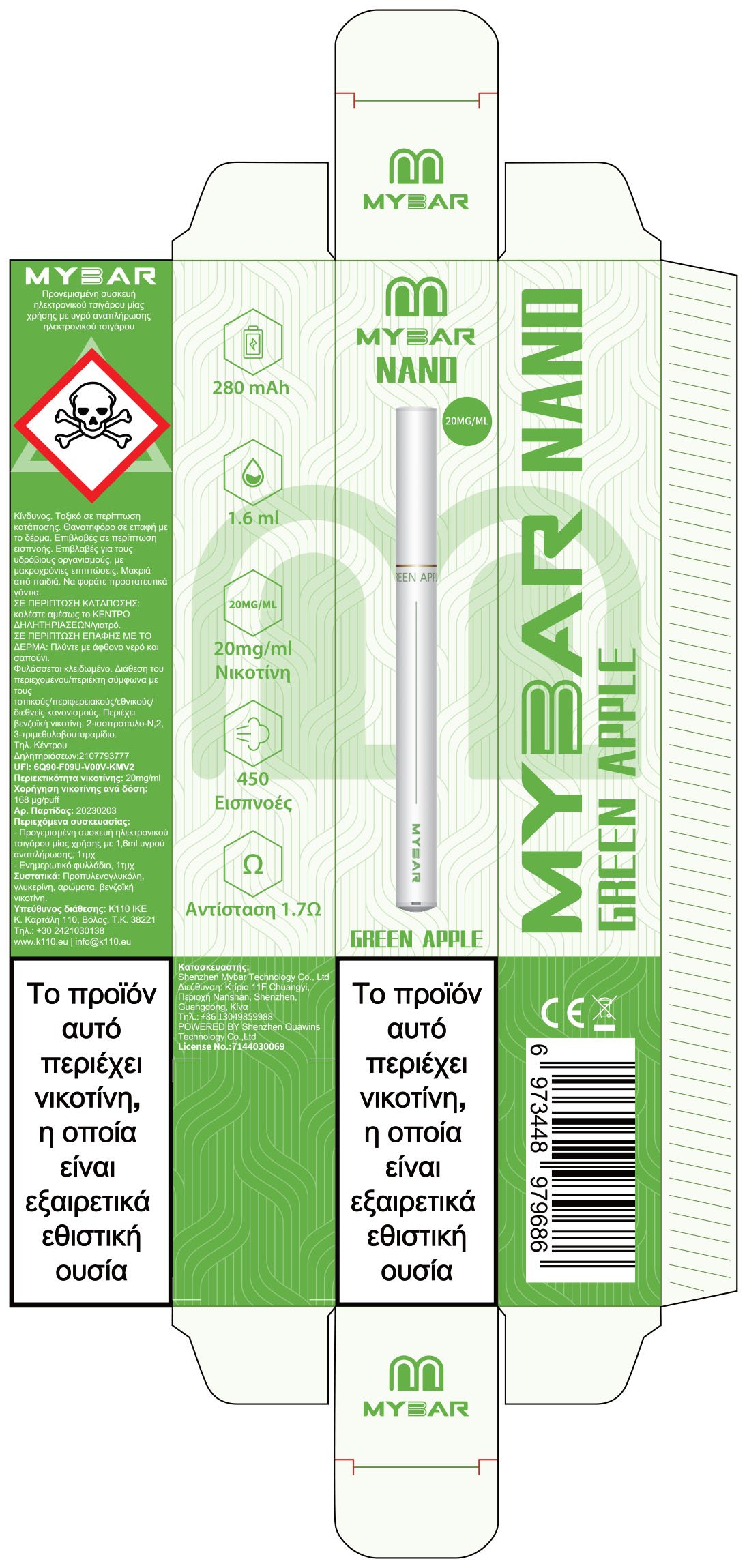 MyBar Nano 20mg 1.6ml Green Apple | Disposable προγεμισμένο με υγρό αναπλήρωσης και απόδοση έως 450 εισπνοές.