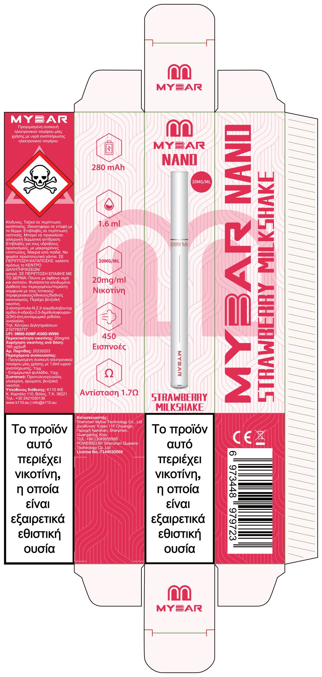 MyBar Nano 20mg 1.6ml Strawberry Milkshake | Disposable προγεμισμένο με υγρό αναπλήρωσης και απόδοση έως 450 εισπνοές.