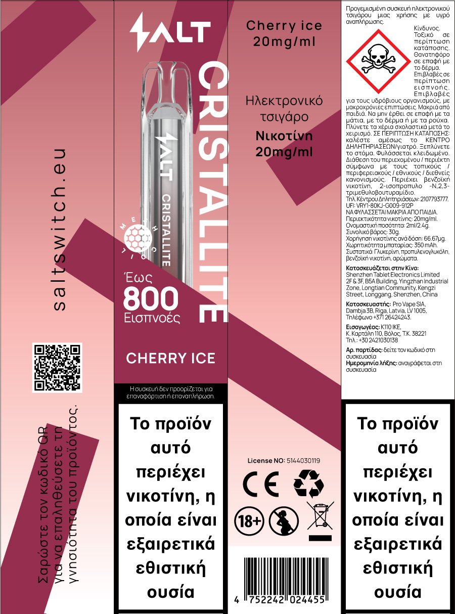 Salt Cristallite 20mg 2ml Cherry Ice | Pod μίας χρήσης προγεμισμένο με υγρό αναπλήρωσης
