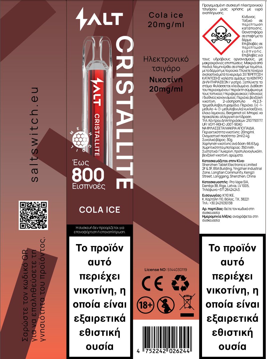 Αναζητάτε μια νέα εμπειρία; Το ηλεκτρονικό τσιγάρο μιας χρήσης, SALT CRISTALLITE θα σας χαρίσει μια πραγματική απόλαυση μέσα από την ποικιλία γεύσεων. Το SALT CRISTALLITE προσφέρει μια ασύγκριτη ατμιστική εμπειρία. Από την απόδοση γεύσης έως τη βελτιστοποιημένη ροή αέρα και το εργονομικό επιστόμιο, δίνει την ευκαιρία στον χρήστη να απολαύσει μια μοναδική γεύση.