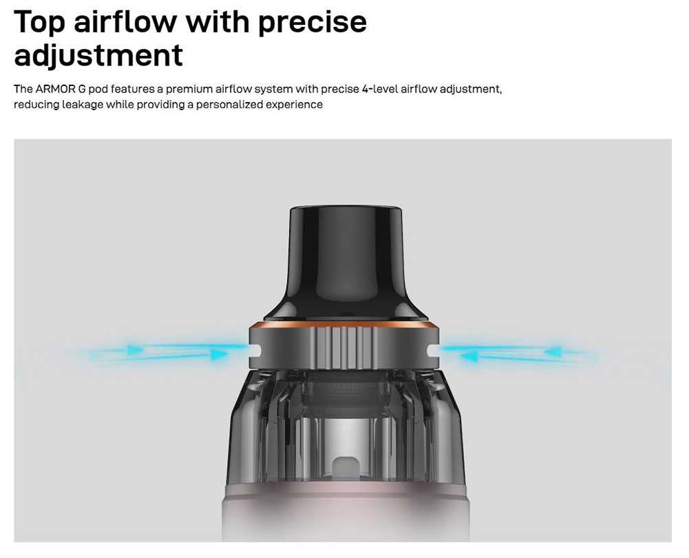 Το ARMOUR G διαθέτει μπαταρία 3000 mAh και πατενταρισμένη τεχνολογία Mega Batt η οποία του επιτρέπει να παρέχει σταθερή μέγιστη ισχύ 80W. Χρησιμοποιεί την πιο πρόσφατη τεχνολογία Neo PULSE MODE και Corex, παρέχοντας ισχυρότερη απόδοση και βελτιωμένη γευστική εμπειρία. Οι δεξαμενές ARMOUR G διαθέτουν κορυφαίο σχεδιασμό ροής αέρα και γεμίζουν από πάνω, μειώνοντας σημαντικά την πιθανότητα διαρροής.