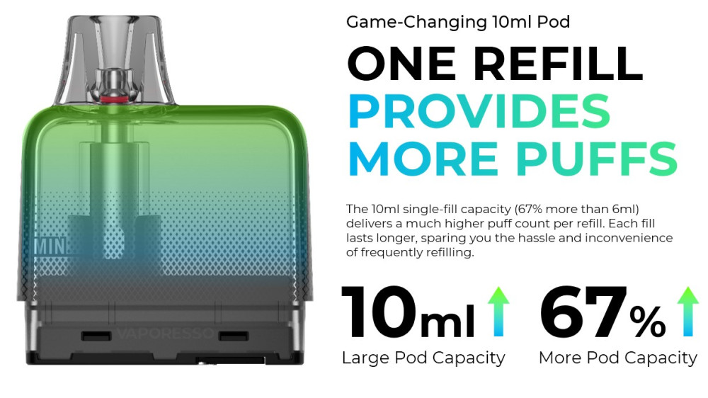 Η χωρητικότητα των 10ml της Eco Nano Plus δεξαμενής (67% μεγαλύτερη από τα 6ml) προσφέρει πολύ περισσότερες εισπνοές ανά γέμισμα. Κάθε πλήρωση υγρού διαρκεί αισθητά περισσότερο, εξαλείφοντας την ταλαιπωρία και τη συχνότητα των συνεχών refills.