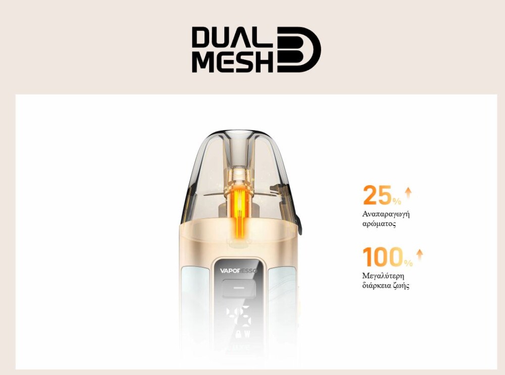 Το LUXE X pod με DUAL MESH και 0.4Ω αντίσταση. Η τεχνολογία θέρμανσης COREX, που εφαρμόζεται με Morph-MESH και Cumulus Cotton στην αντίσταση, εξασφαλίζει γρήγορη και ομοιόμορφη θέρμανση και παρέχει εκπληκτικά ενισχυμένη γεύση και μεγαλύτερα σύννεφα.