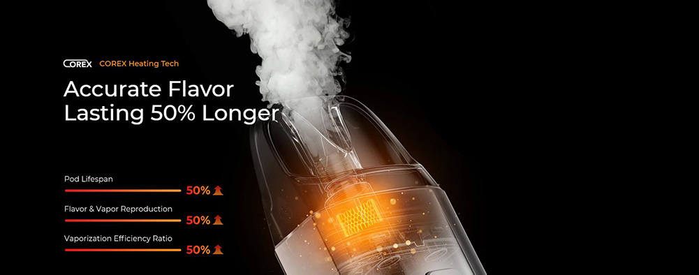 Η μοναδική δομή της αντίστασης Morph-Mesh και το πιο αφράτο βαμβάκι COREX εξασφαλίζουν πιο ομοιόμορφη θέρμανση και ταχύτερη παροχή υγρού. Βελτιώνει την αναλογία απόδοσης για να παρέχει σταθερή γεύση και να παρατείνει τη διάρκεια ζωής της αντίστασης κατά 50%.