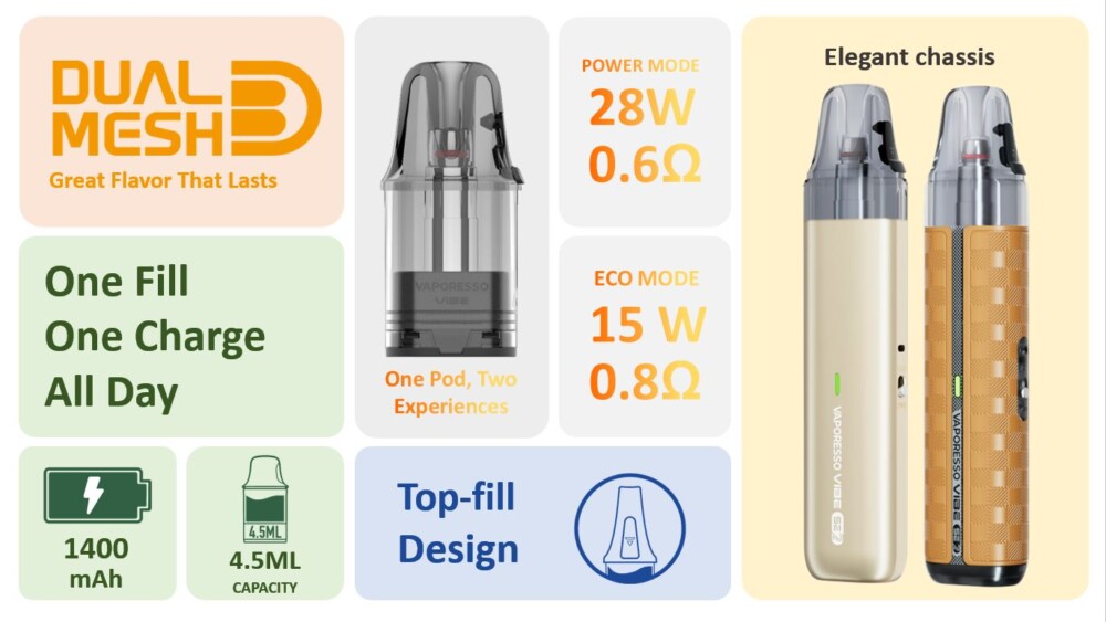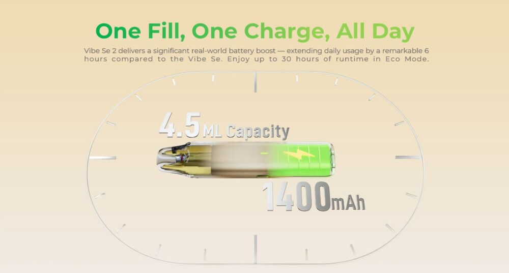 Το Vibe SE 2 συνεχίζει την επιτυχημένη σειρά Vibe με την υπογραφή Dual Mesh technology, προσφέροντας ακόμα πιο γεμάτη γεύση και σταθερή απόδοση σε κάθε τζούρα. Διαθέτει αναβαθμισμένη μπαταρία 1400mAh για μεγαλύτερη αυτονομία και πρακτικό top-fill σύστημα για εύκολο γέμισμα χωρίς ταλαιπωρία. Ένα entry-level MTL device, ιδανικό για αρχάριους που θέλουν απλότητα, άνεση και ποιότητα.