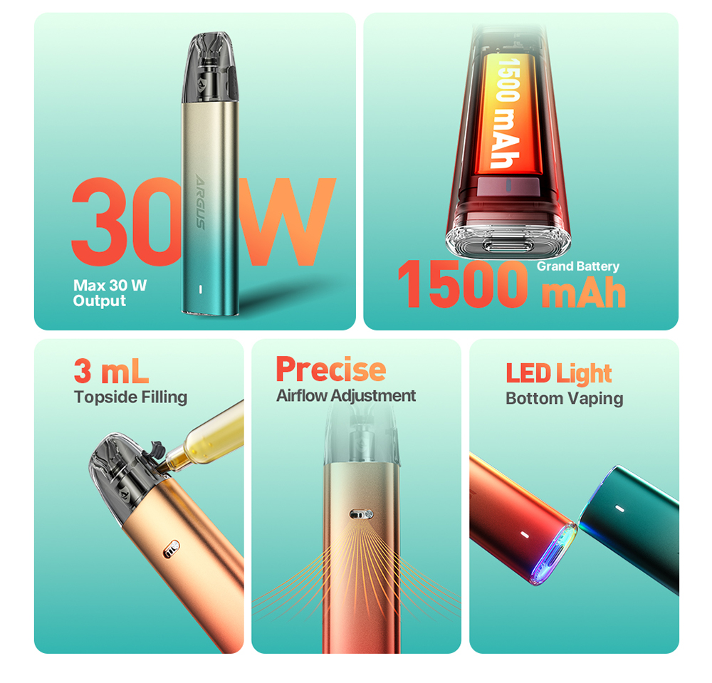 Το Argus G2 Mini Plus είναι η αναβαθμισμένη έκδοση του Argus G2 Mini με πιο ισχυρή μπαταρία 1500mAh, χωρητικότητα υγρού 3ml και πιο βολικό σύστημα πλήρωσης από επάνω για μεγαλύτερη προστασία από διαρροές. Η ρύθμιση της ροής του αέρα βρίσκεται στο μπροστινό μέρος για μεγαλύτερη ευκολία, ενώ η λυχνία LED επιτρέπει στον χρήστη να ελέγχει την κατάσταση της μπαταρίας.