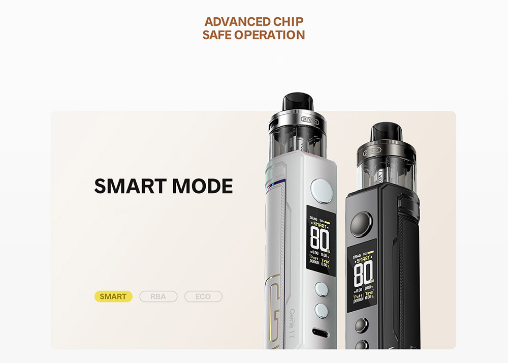 Το DRAG X2 υιοθετεί το νέο chip Gene.TT 2.0, το οποίο αποδίδει έξυπνα την καλύτερη ισχύ και σας προσφέρει 3 λειτουργίες: Smart, RBA και ECO.