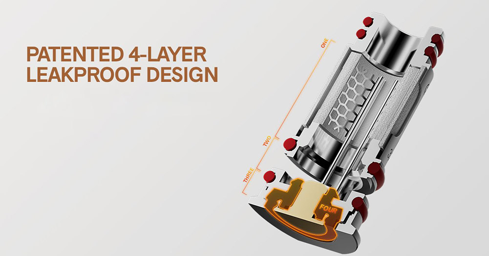 Η διπλή δομή σχήματος L στο κάτω μέρος διατηρεί μια ισορροπημένη πίεση, η οποία εμποδίζει τη διαρροή του υγρού.