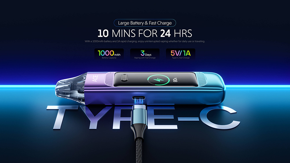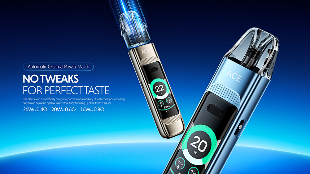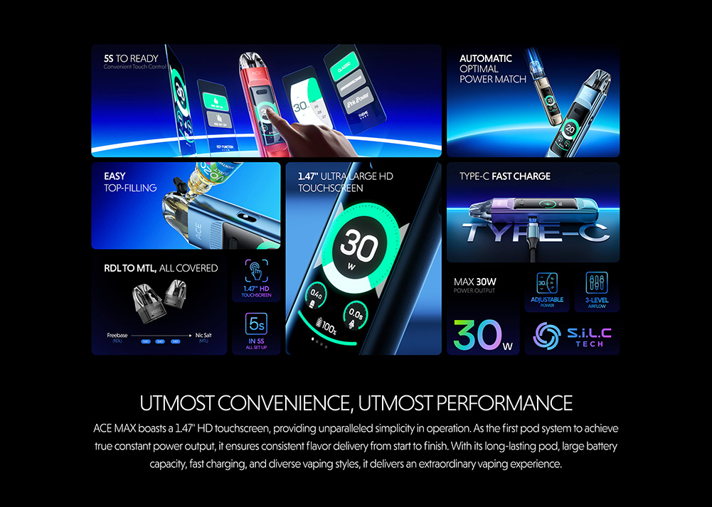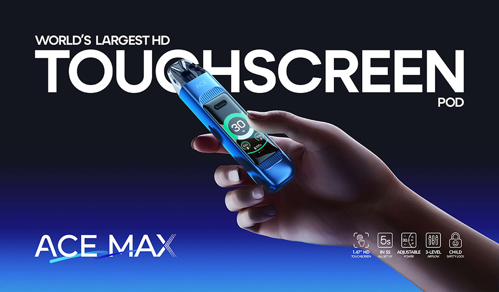 Το ACE MAX διαθέτει οθόνη αφής HD 1,47″, η οποία παρέχει απλότητα στη λειτουργία. Ως το πρώτο σύστημα pod που επιτυγχάνει πραγματικά σταθερή ισχύ, εξασφαλίζει σταθερή απόδοση γεύσης από την αρχή μέχρι το τέλος. Με το pod μακράς διαρκείας, τη μεγάλη χωρητικότητα μπαταρίας, την γρήγορη φόρτιση και τα ποικίλα στυλ ατμίσματος, προσφέρει μια εξαιρετική εμπειρία ατμίσματος.