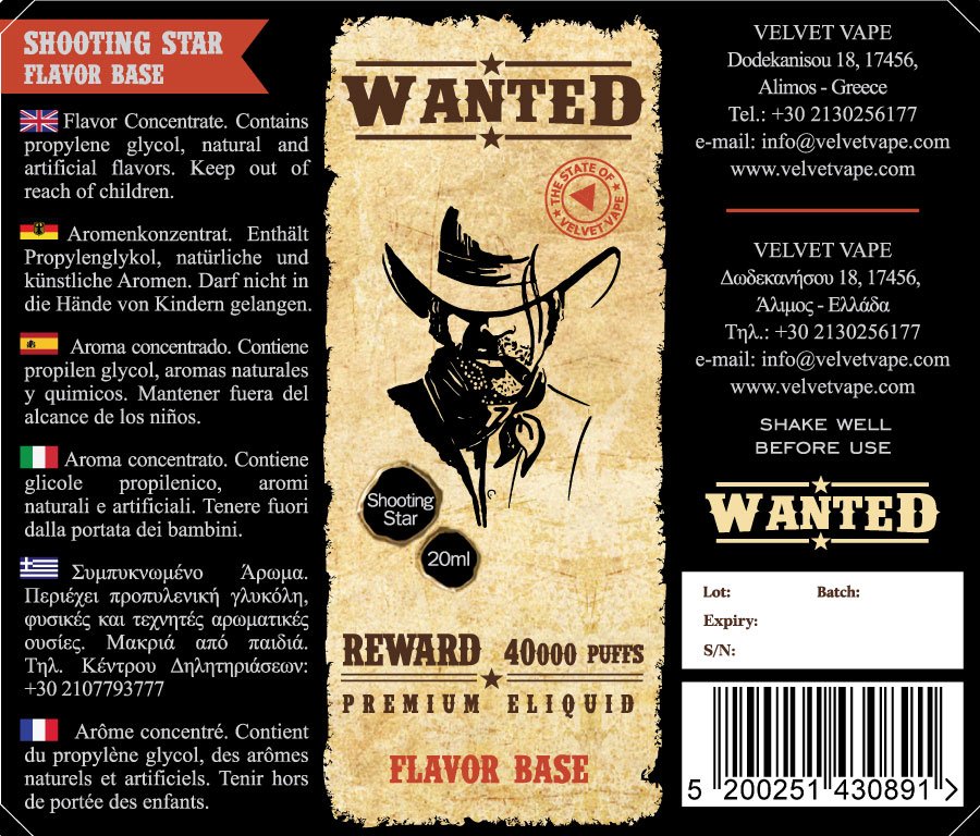 Ένα νέο αστέρι γεννιέται! Το Wanted Shooting Star είναι ένα πολύ ισορροπημένο ατμιστικό υγρό με “μεσαία” ένταση γεύσης. Σε αυτό το υγρό αναπλήρωσης θα γευτείτε μια εκλεπτυσμένη εκδοχή φίνου Αμερικάνικου καπνού, τόνους καυτής μαύρης ζάχαρης και μια υποψία κέδρου στο βάθος.